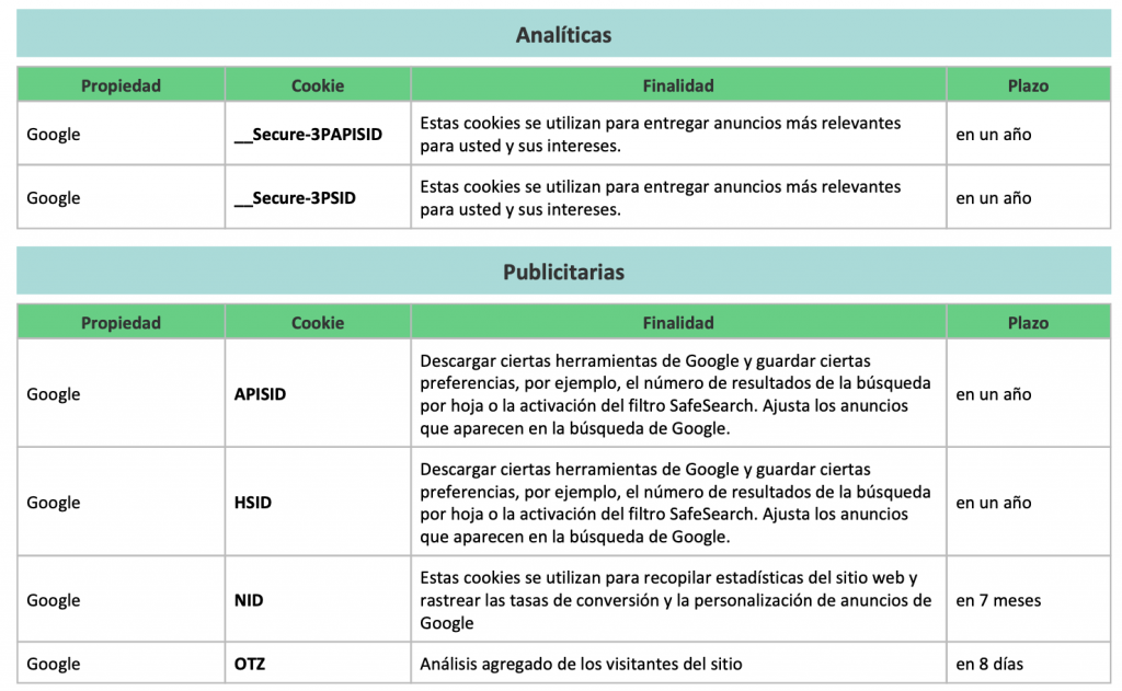 COOKIES UTILIZADAS EN ESTE SITIO WEB
